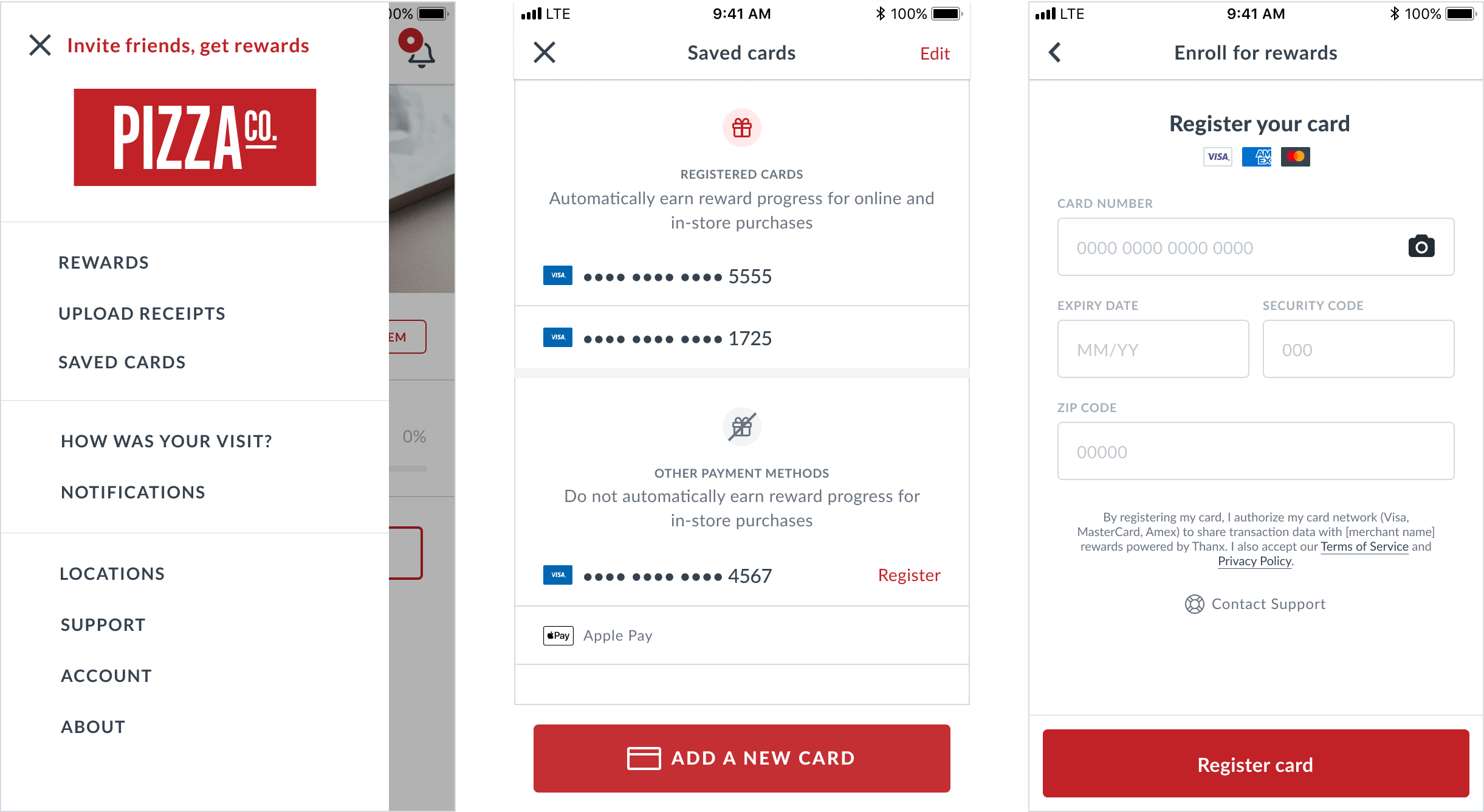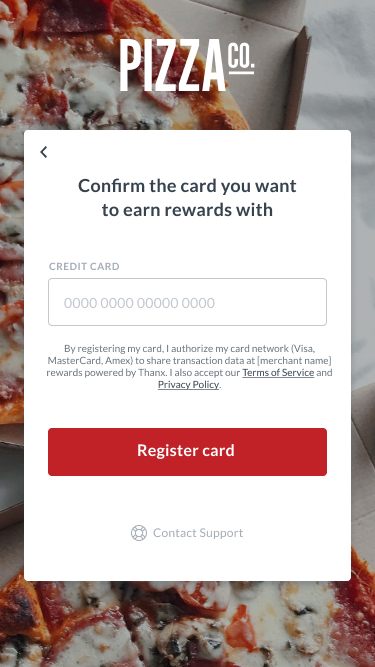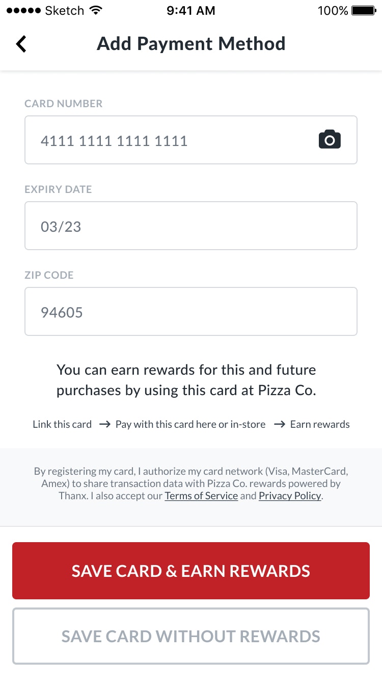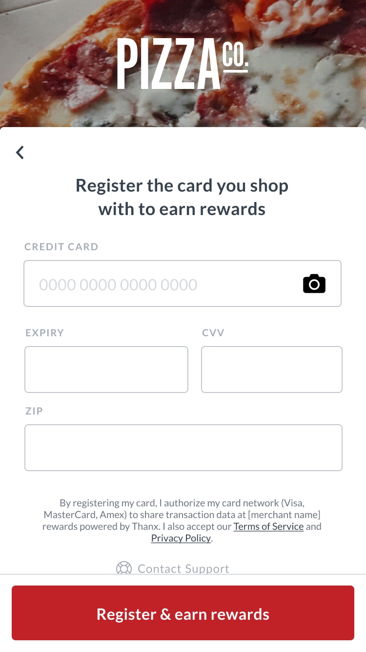 rewards powered by Thanx. I also accept our Terms of Service and Privacy Policy.Loyalty app add payment method