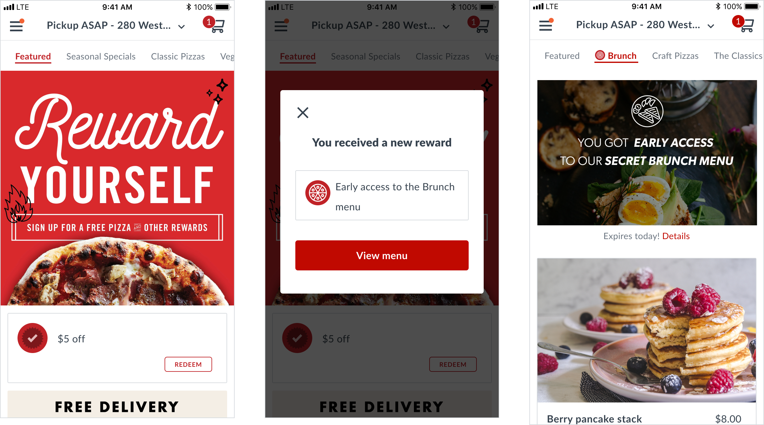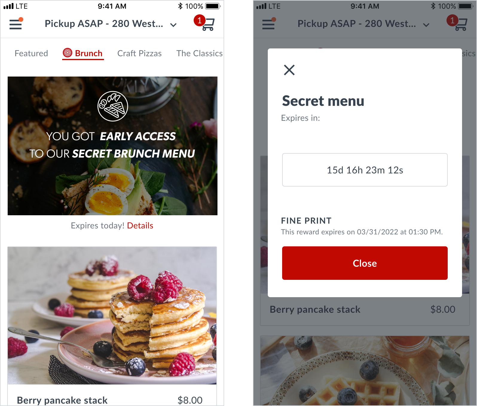 Hidden menus are a way to give customers access to items they wouldn’t normally be able to order. For online redemption this means having a menu configured with the digital ordering provider that is not visible to customers. Online redemptions for this reward reveals this menu in the app. There is no redeem button. Instead when a user is granted this reward, a popup appears when they open the app. The popup notifies the user that they got the hidden menu and then takes the user to the menu.