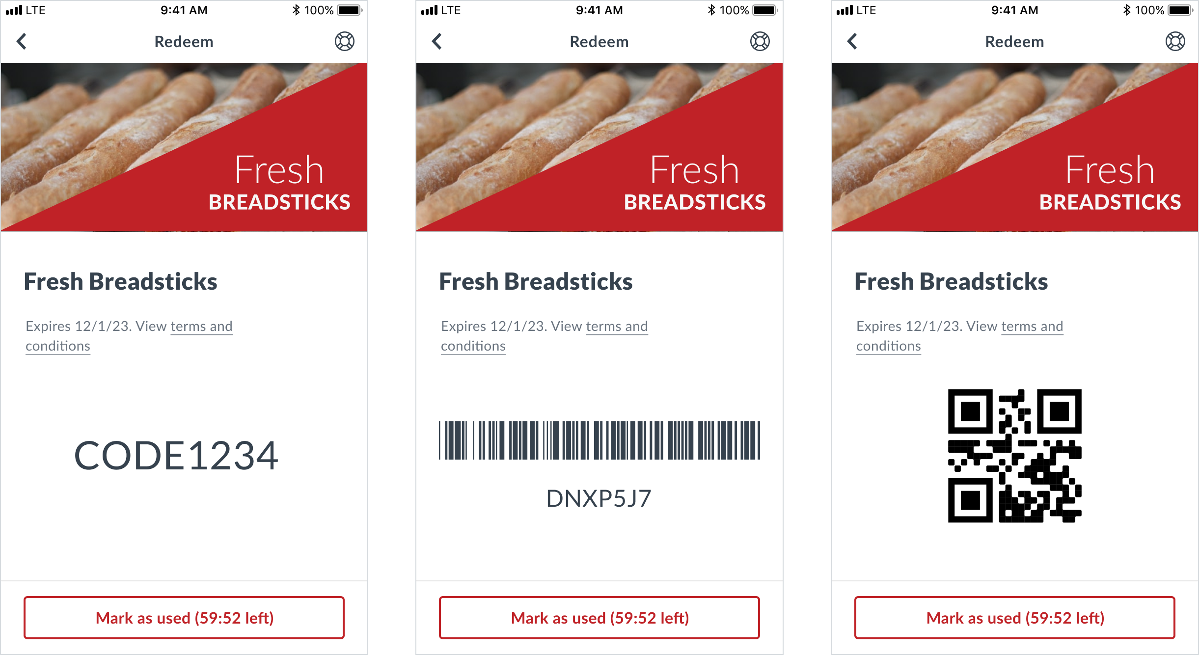 In-store redemption can be configured to deliver a code to the screen that a server keys into the POS. This can also be displayed as a bar code or a QR code.