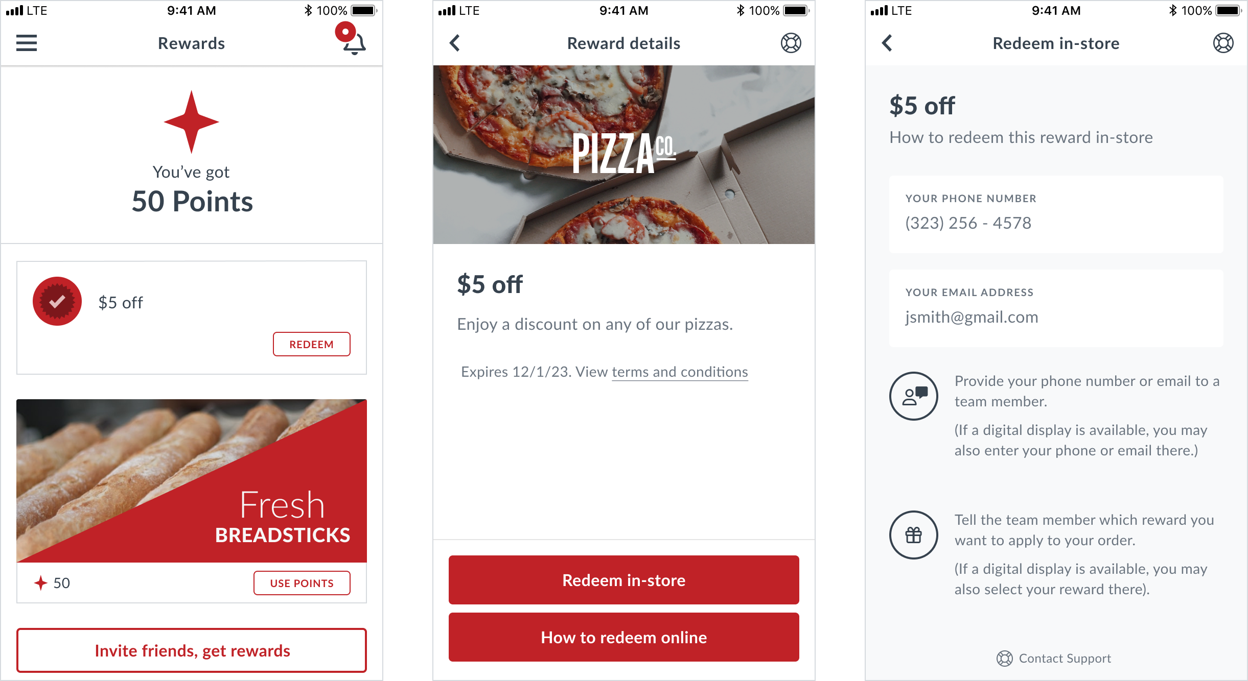 Customers can skip the app and redeem rewards in-store via the POS if the merchant is using the Toast in-store redemption integration. HOW IT WORKS Option 1: The customer gives their phone or email to the team member at the counter. The team member enters those details into the POS and receives a list of available rewards. Option 2: The customer uses a customer-facing display at the counter to enter their email or phone numbe rand receives a list of available rewards on the display. WHAT HAPPENS IN THE APP Even though the customer can access their rewards in-store via the POS, the app is also still able to display available rewards. However, because redemption now happens via the POS, the redemption flow in the app now becomes a page that instructs the customer on how to redeem rewards via the POS.