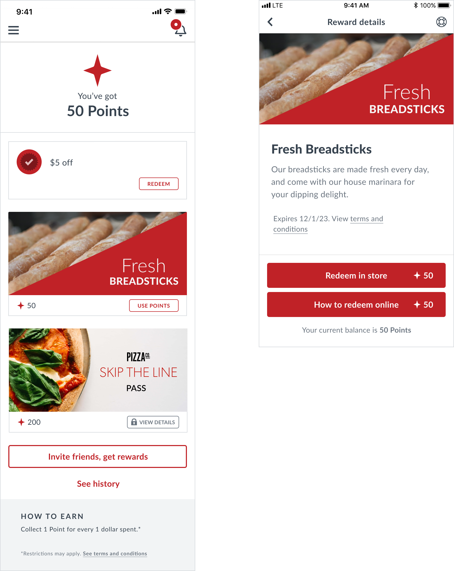 When a reward is ready for redemption, a button appears that says “Redeem”. If a reward costs points to redeem, the cost of the points is shown on the reward. Tapping into a reward banner displays a detail view with more information such as the reward description, fine print, and expiration date. Again a CTA Button is only present when a reward is ready to be redeemed. Depending on your configuration and the type of reward, a reward may be redeemable online (integrated ordering only), or in-store (loyalty and ordering). If a reward costs points to redeem but a user does not have enough points, they can still view the detail page of the reward. However, the redeem button will be disabled and will say “Locked”.